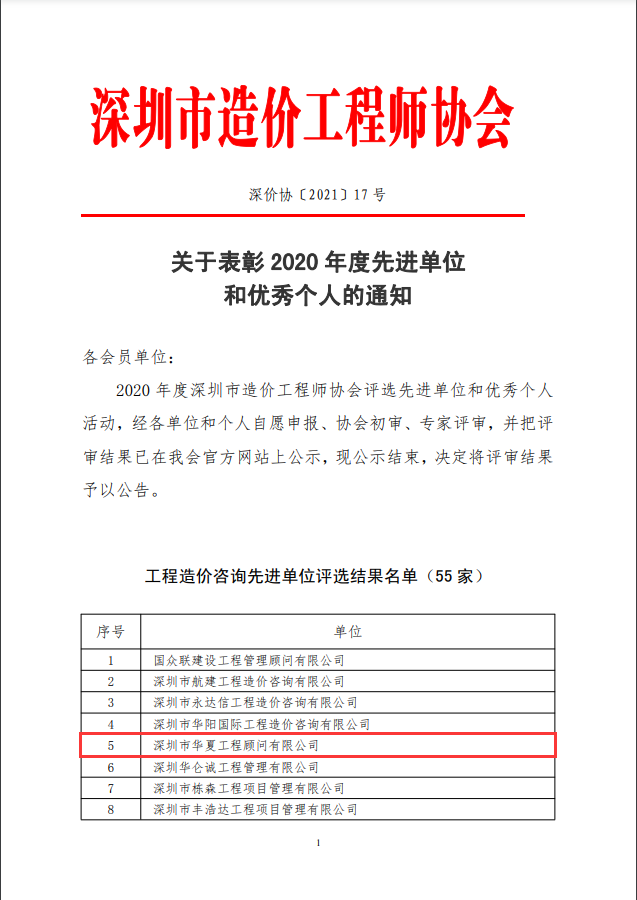 深圳市造價(jià)工程師協(xié)會(huì)年度評(píng)優(yōu)旨在表彰在造價(jià)行業(yè)管理規(guī)范、服務(wù)質(zhì)量?jī)?yōu)、社會(huì)信譽(yù)好、經(jīng)營(yíng)效率高的造價(jià)咨詢單位及優(yōu)秀的個(gè)人會(huì)員,我司積極參與協(xié)會(huì)組織的各項(xiàng)評(píng)優(yōu)工作,獲得了多項(xiàng)榮譽(yù):